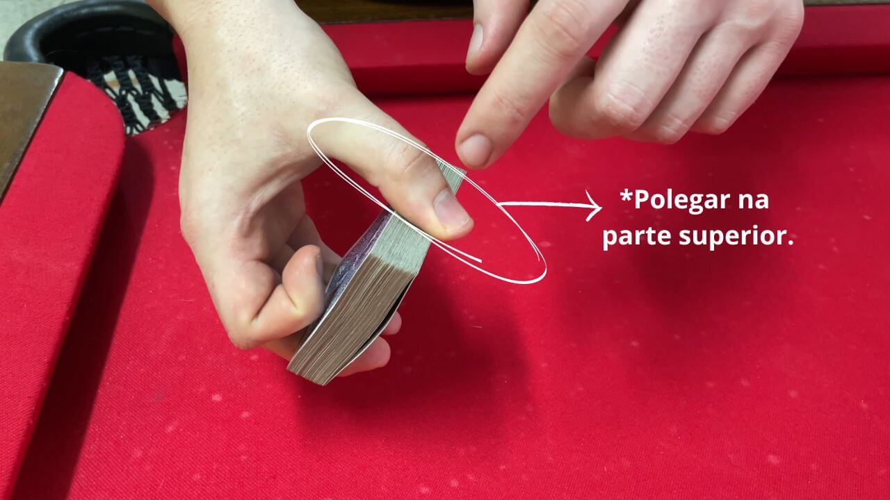 Para aprendermos a como embaralhar as cartas através do método Riffle Shuffle, vamos pegar o baralho posicionando o polegar na parte superior, os três últimos dedos vão servir como base na parte inferior e seu indicador vai ser a ponte no centro do baralho.