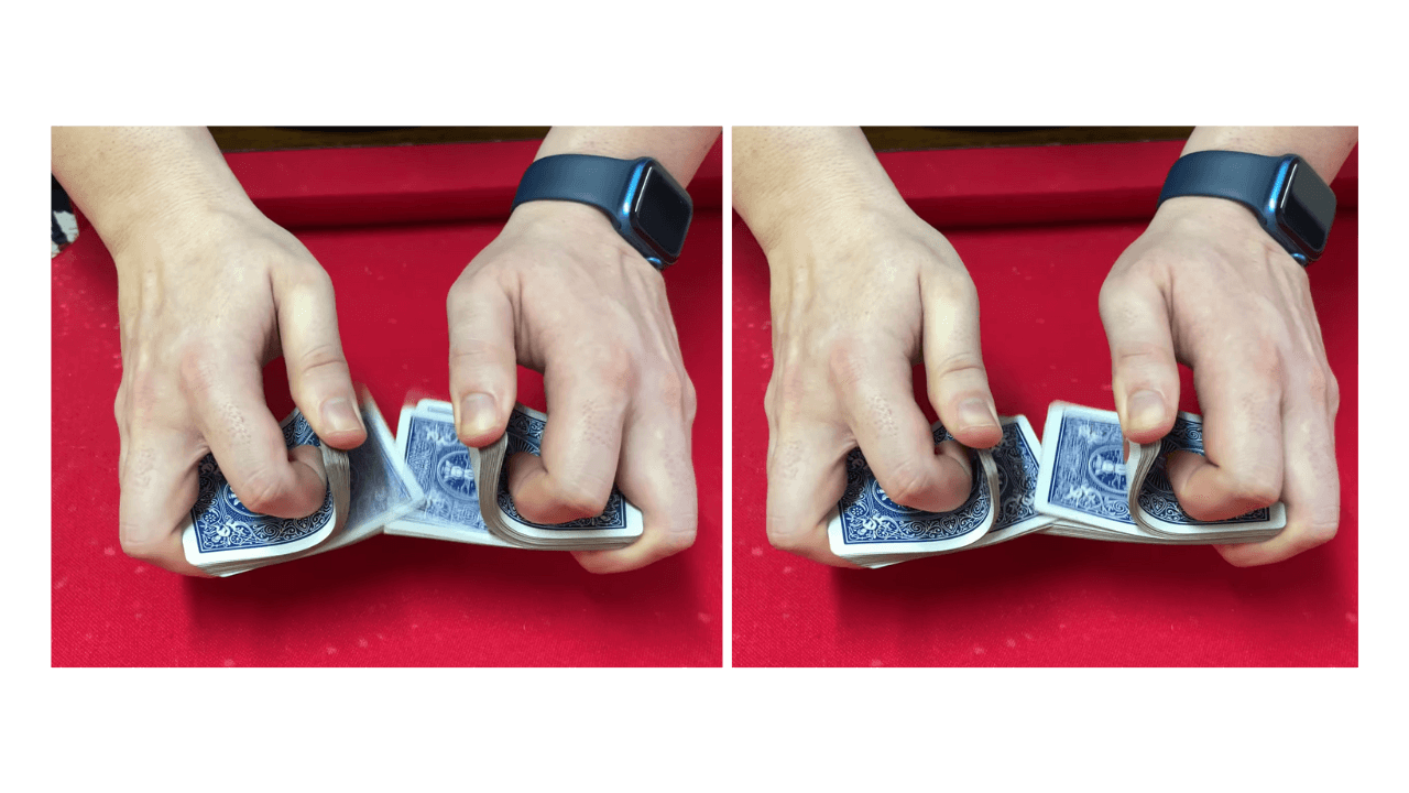 Após aprender a fazer a distribuição das cartas, vamos fazer o corte delas passando metade das cartas para outra mão e repetindo a posição dos dedos do passo um (em ambas as mãos):