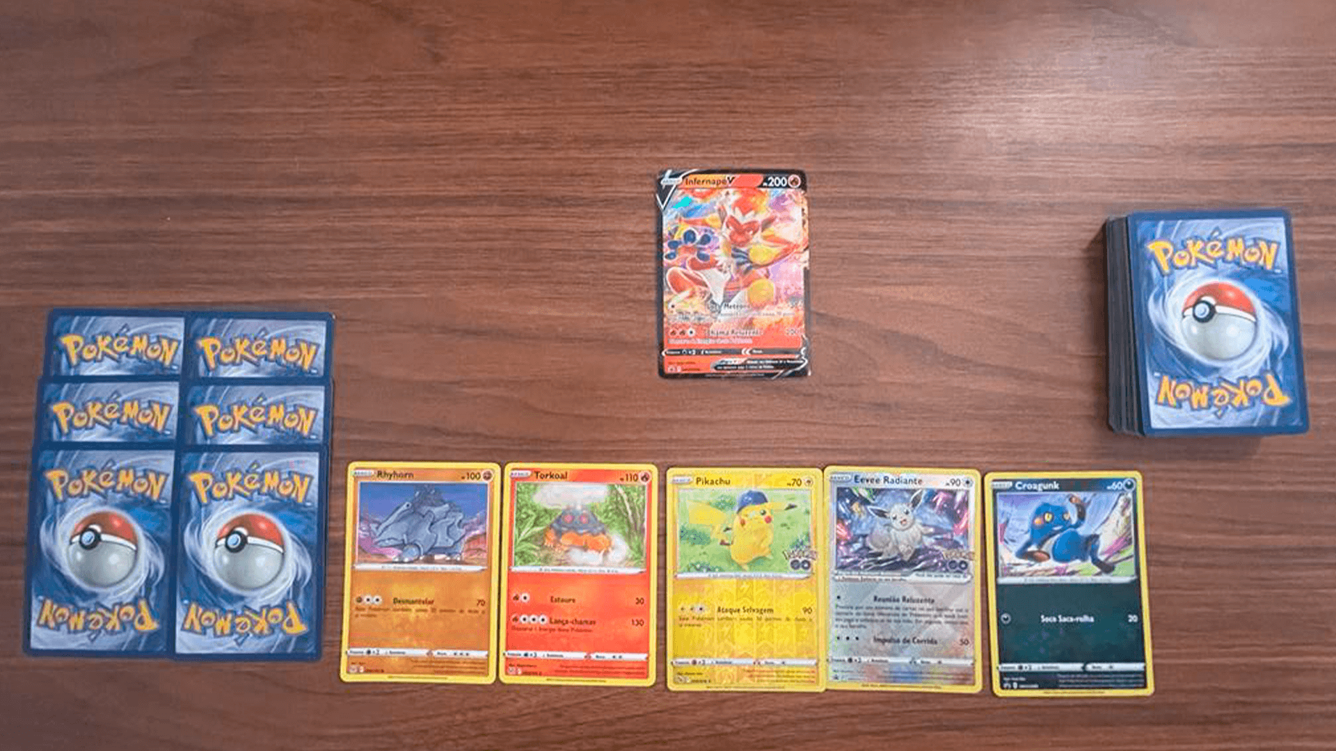 Com as 7 cartas em mãos vamos começar identificando o Pokémon básico, pois somente o básico poderá ser jogado na mesa. Caso não haja nenhuma, embaralhe o deck novamente e tire mais sete cartas. Lembrando que a cada vez que você fizer isso, seu oponente tem direito a tirar uma carta extra.