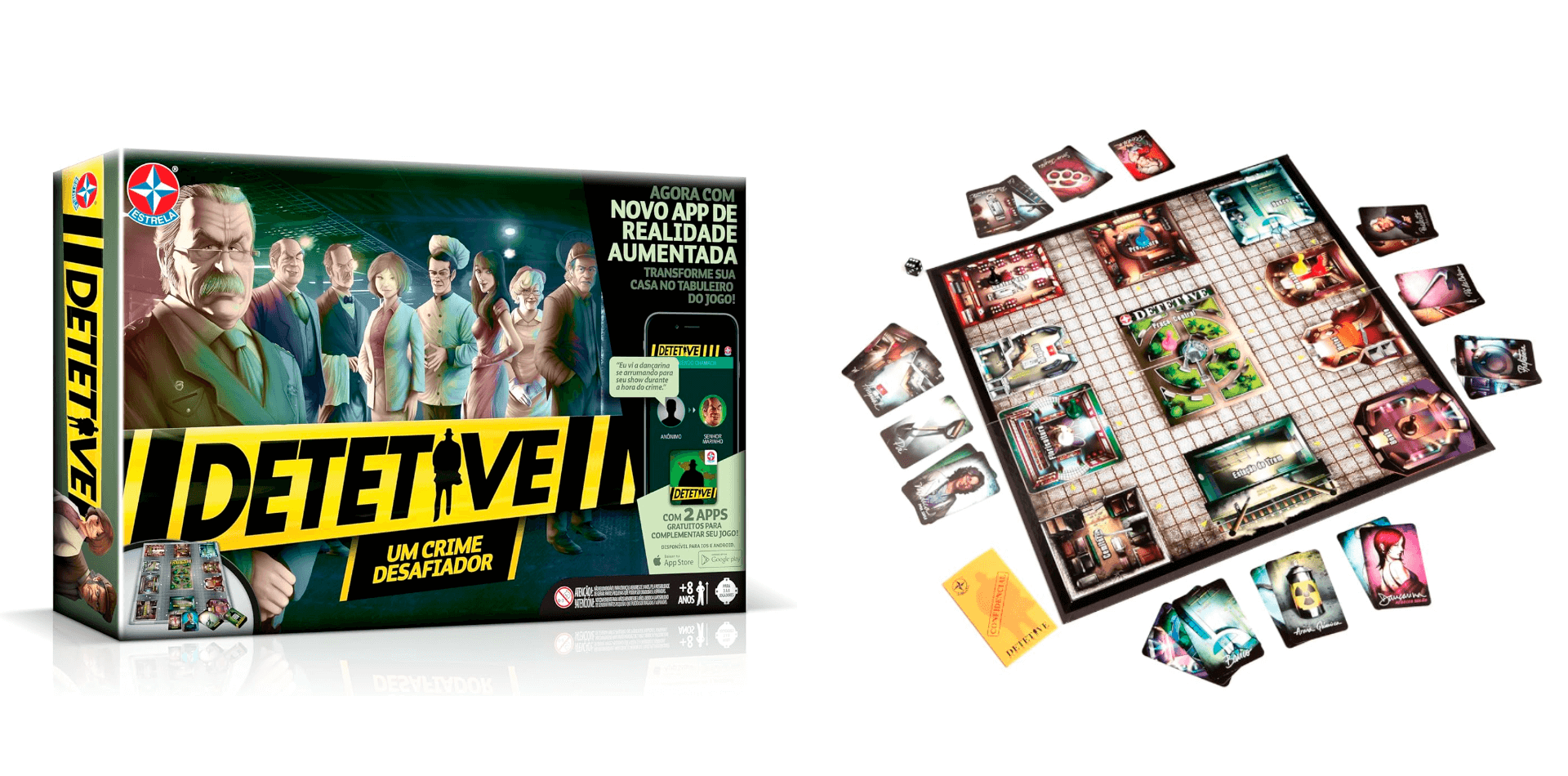 O jogo detetive contém um tabuleiro que representa um imóvel com seus cômodos e uma área central.