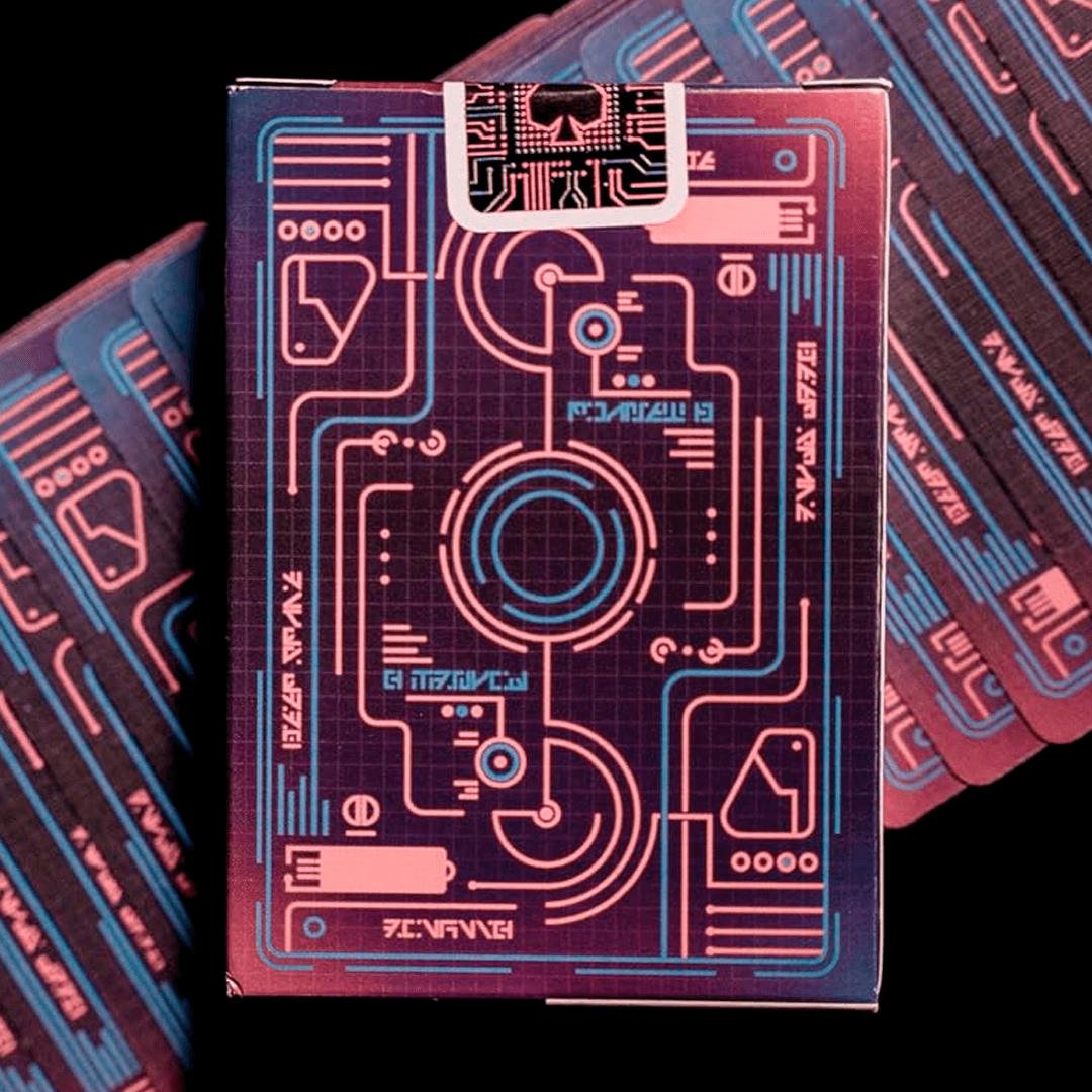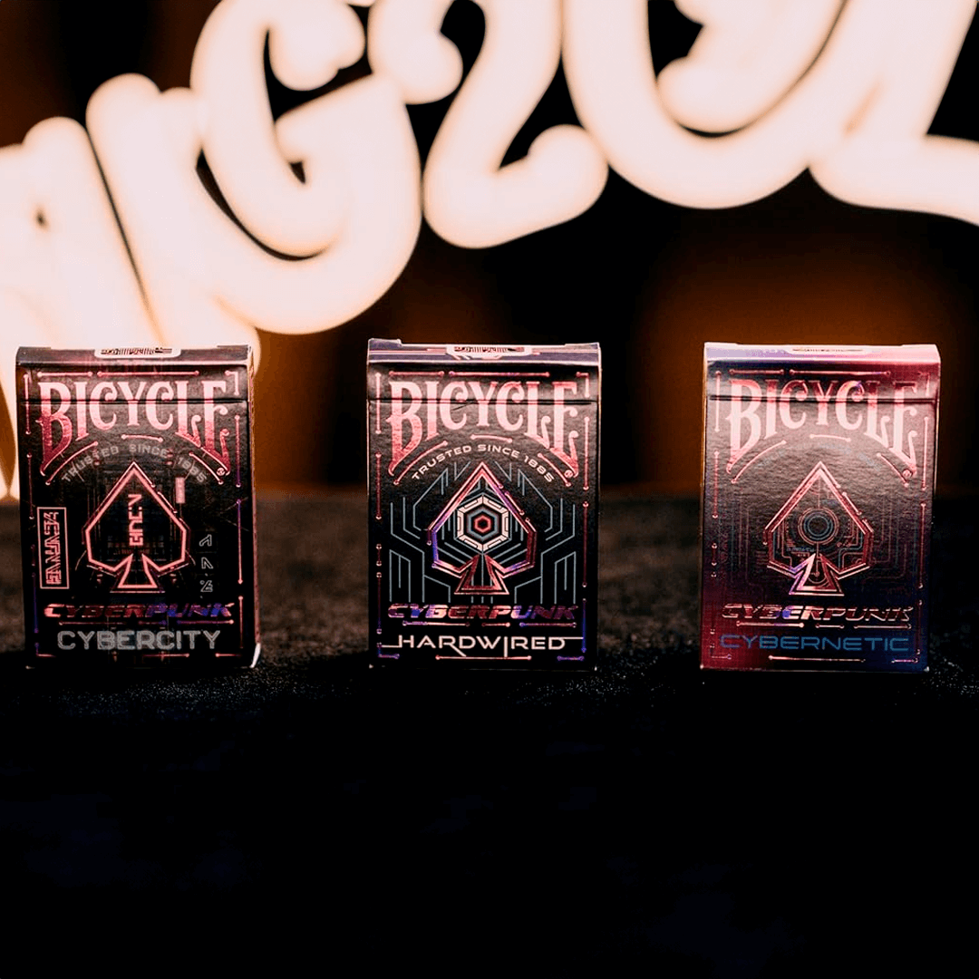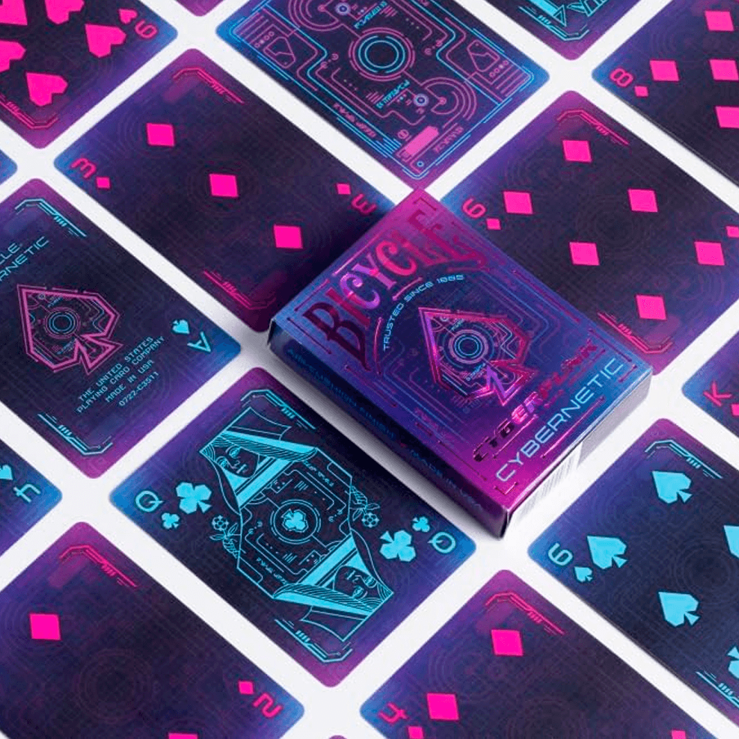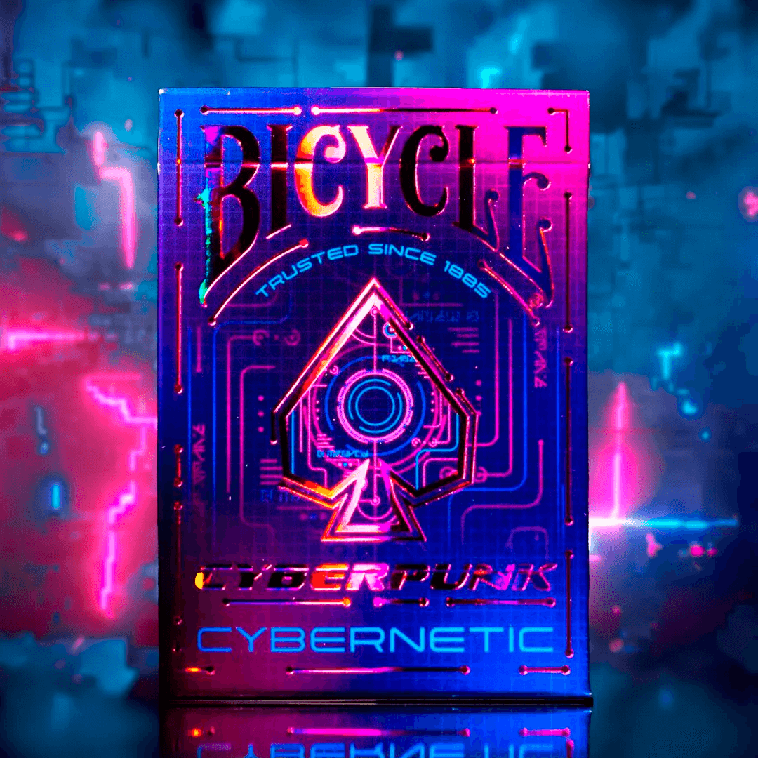 O Bicycle Cyberpunk Cybernetic combina alta tecnologia com a paisagem urbana do futuro. Apresentando ilustrações personalizadas de cartas cibernéticas, este baralho é a combinação perfeita de elementos tradicionais de cartas com um futuro inspirado na ficção científica.