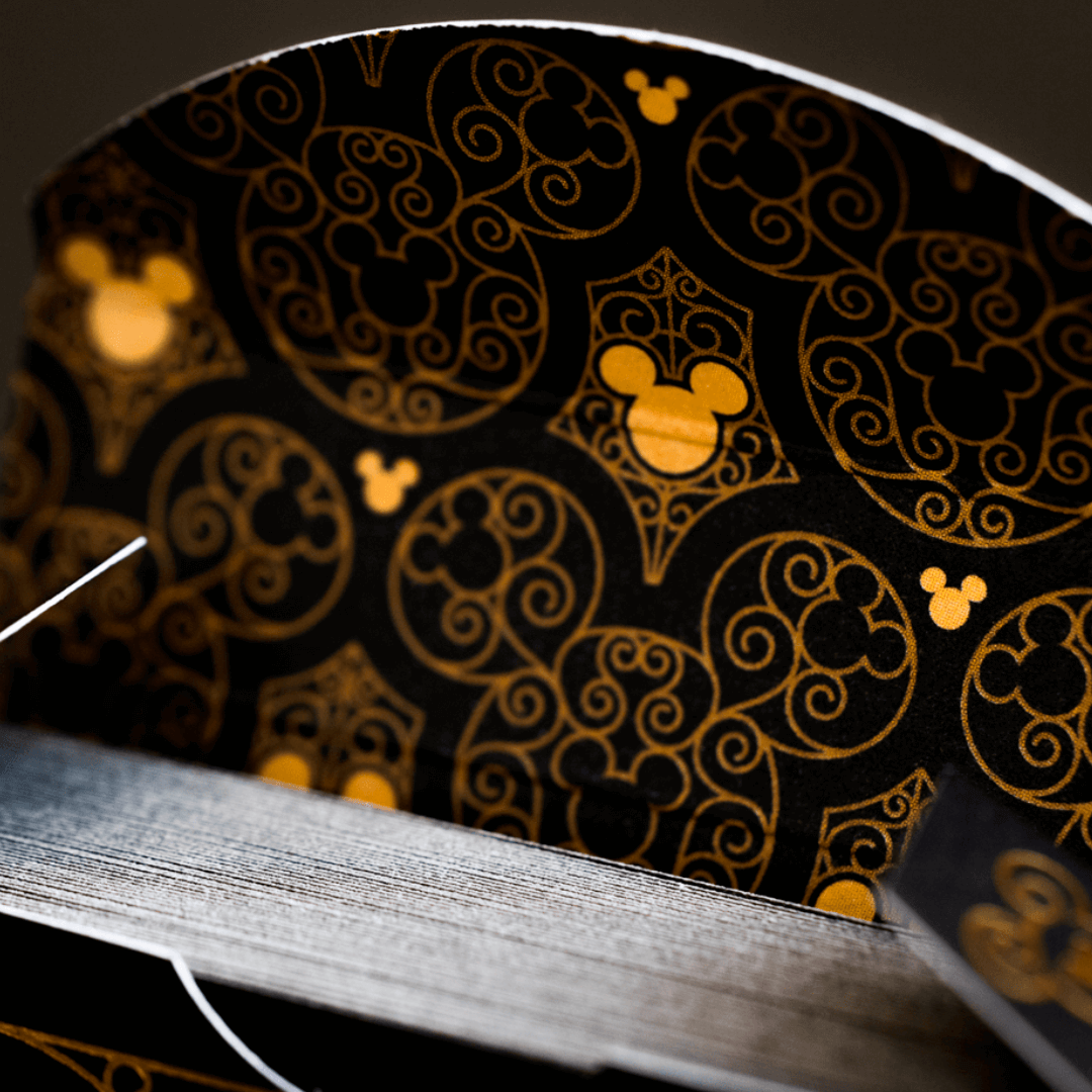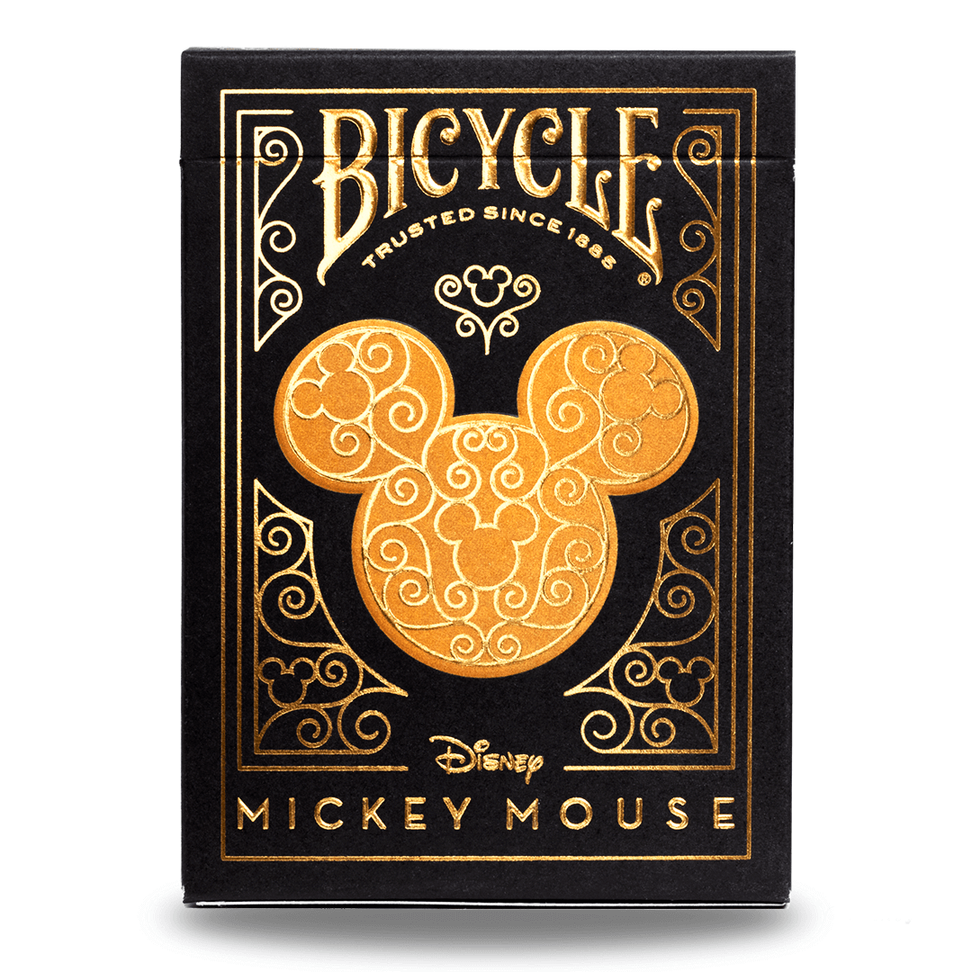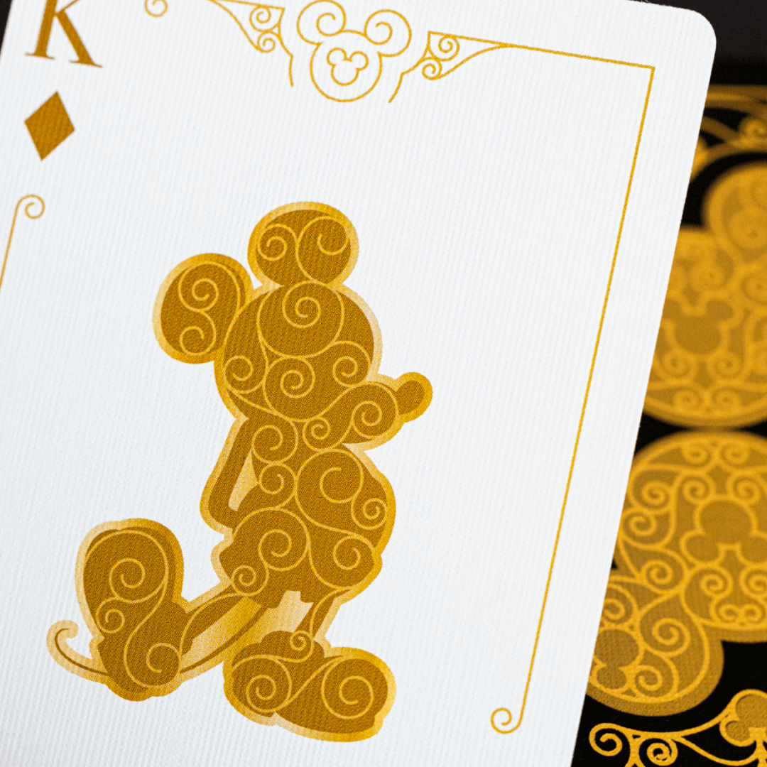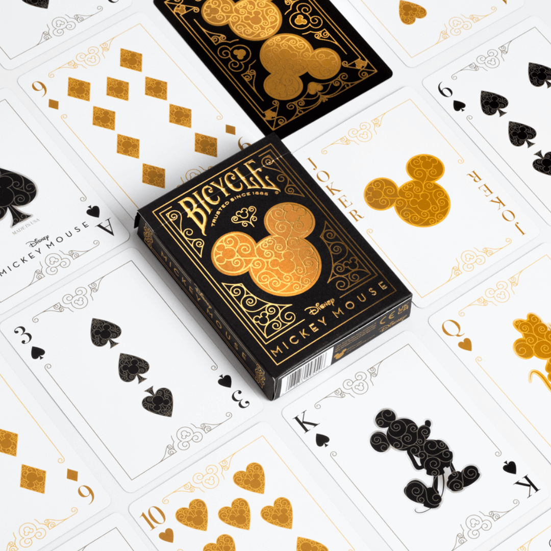 As cartas possuem ilustrações únicas do Mickey Mouse em diferentes poses e trajes nas cores preto e dourado, capturando sua personalidade alegre e cativante. As cartas de Baralho Bicycle Mickey Black and Gold exemplificam luxo e estilo com elementos de design delicados.