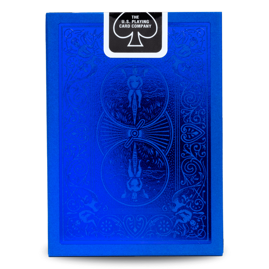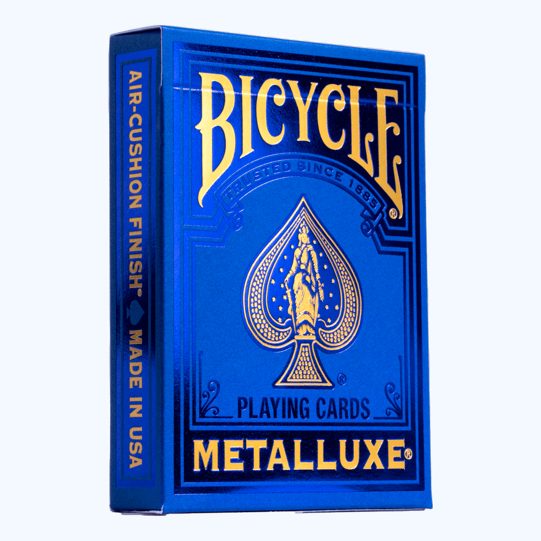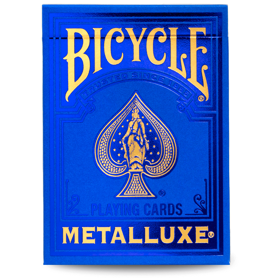 O Baralho Bicycle MetalLuxe Azul com NOVA embalagem premium. Os magníficos baralhos apresentam um design facilmente reconhecível, desta vez com brilho excepcional graças ao fundo folheado.