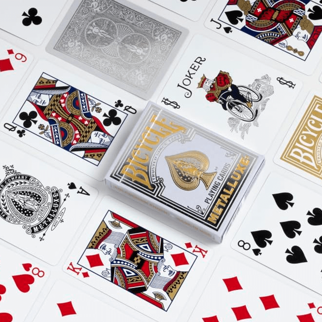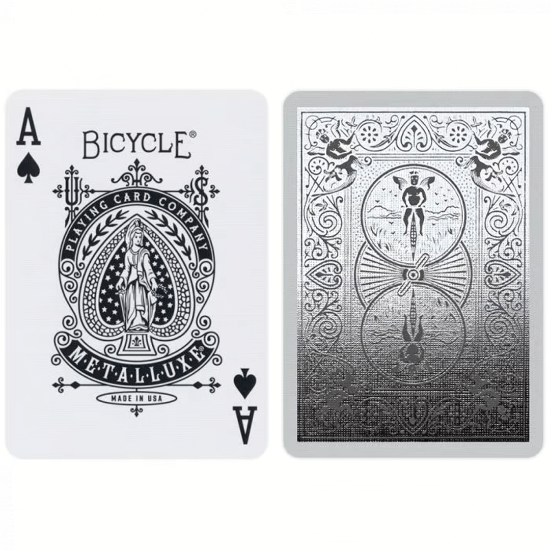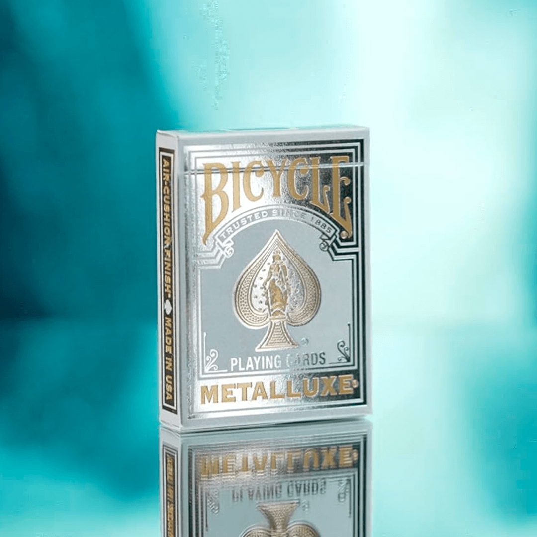 O Baralho Bicycle MetalLuxe Silver com NOVA embalagem premium. Os magníficos baralhos apresentam um design facilmente reconhecível, desta vez com brilho excepcional graças ao fundo folheado.