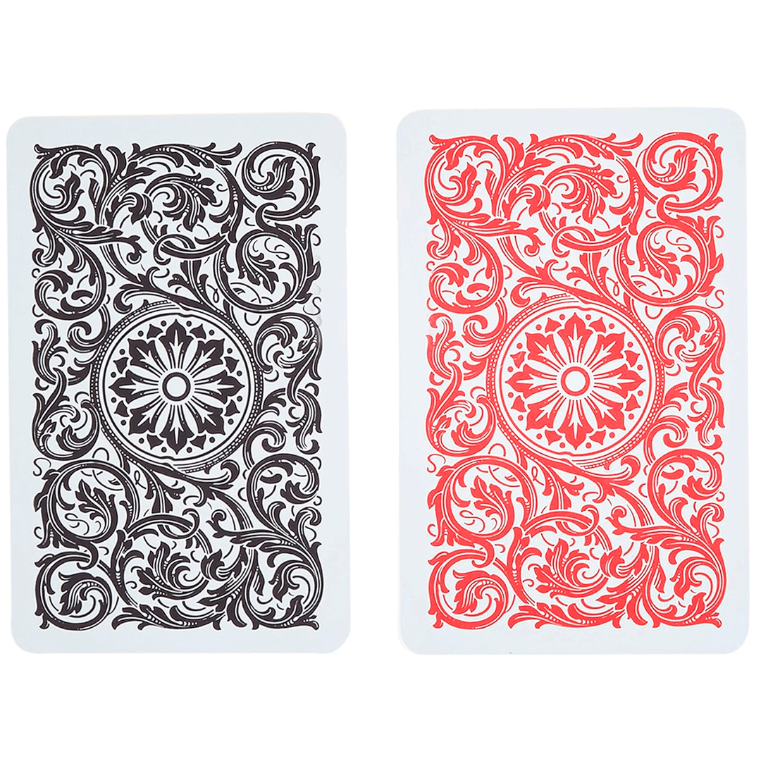 Cada estojo contém 2 baralhos plásticos formato Bridge Size, com uma arte de verso em 2 cores (preto e vermelho).
