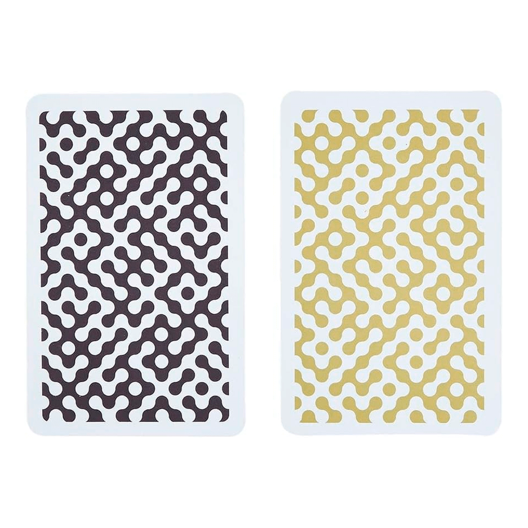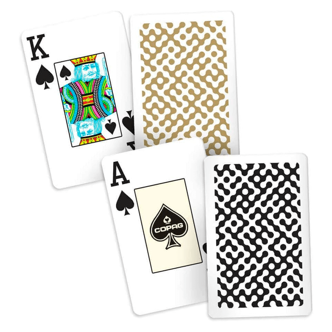 Cada estojo contém 2 baralhos plásticos formato Bridge Size, com uma arte de verso em 2 cores (preto e dourado).