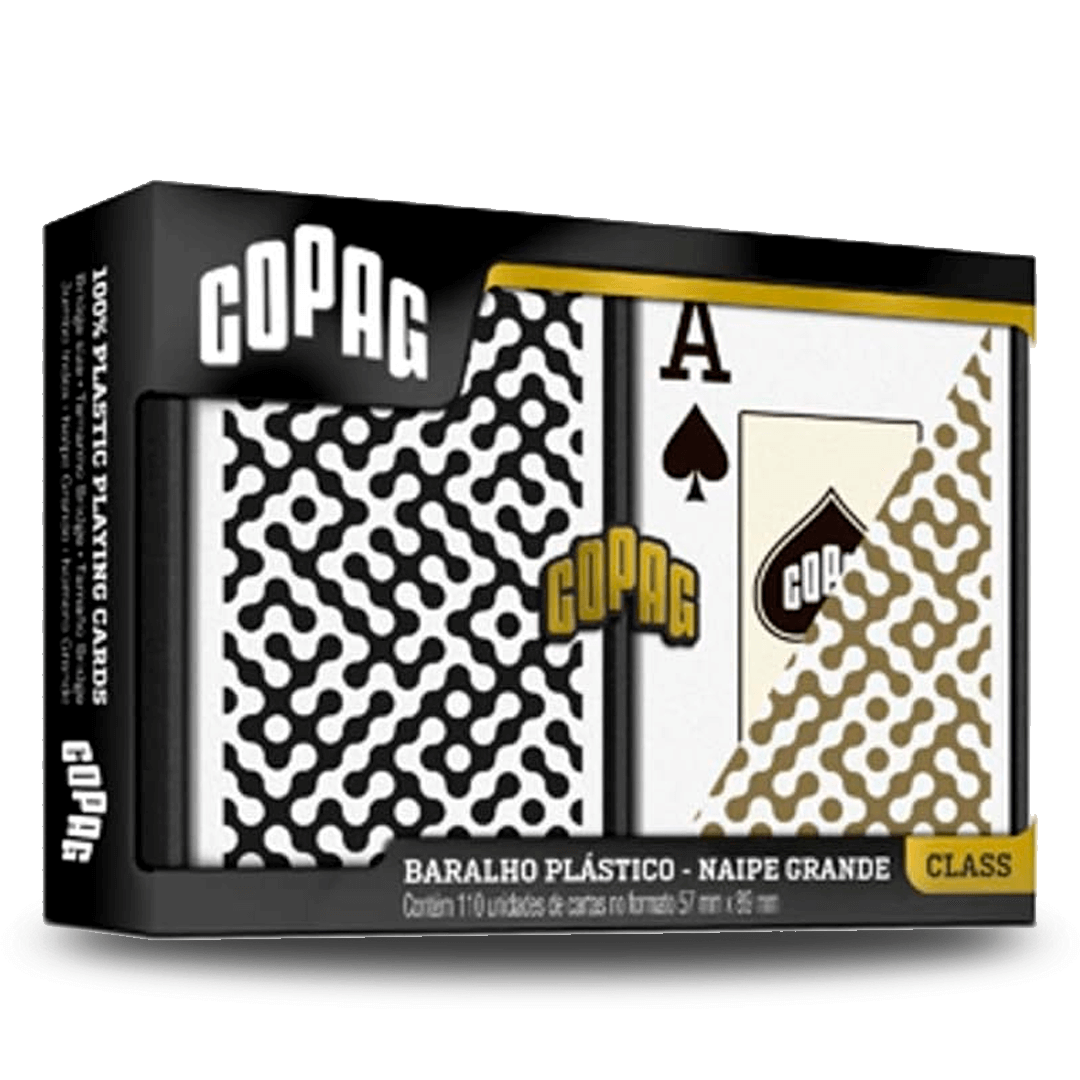 Class é a linha de baralhos de plástico ideal para os jogadores mais exigentes. Os decks possuem alta durabilidade e são resistentes ao manuseio e marcações. No estojo você encontra dois baralhos, um preto e outro dourado. Produto original, lacrado e fabricado pela Copag.