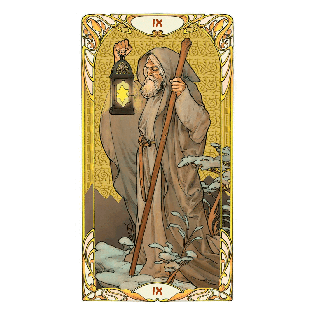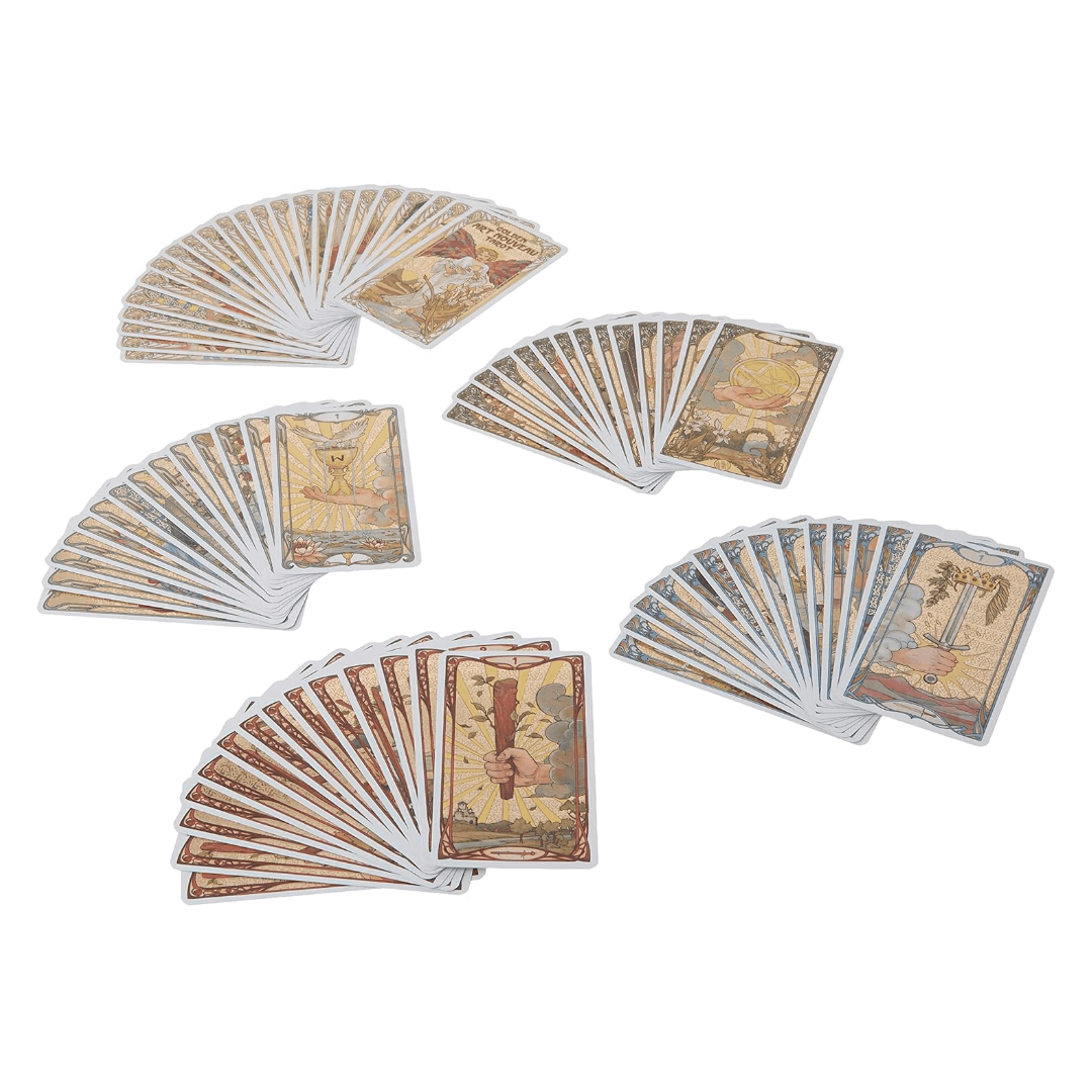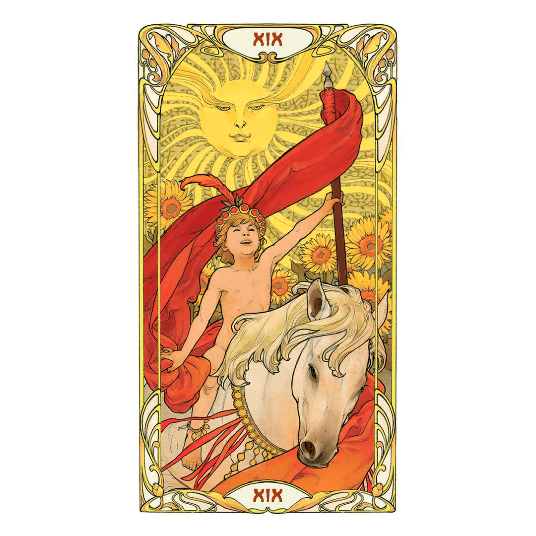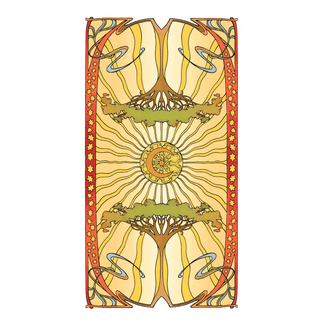 A artista Giulia F. Massaglia captura a essência e estrutura do tarot combinando elementos do estilo Art Nouveau, sendo ricamente ilustradas com elementos característicos do movimento utilzando curvas sinuosas, flores, folhas e padrões decorativos com detalhes dourados.
