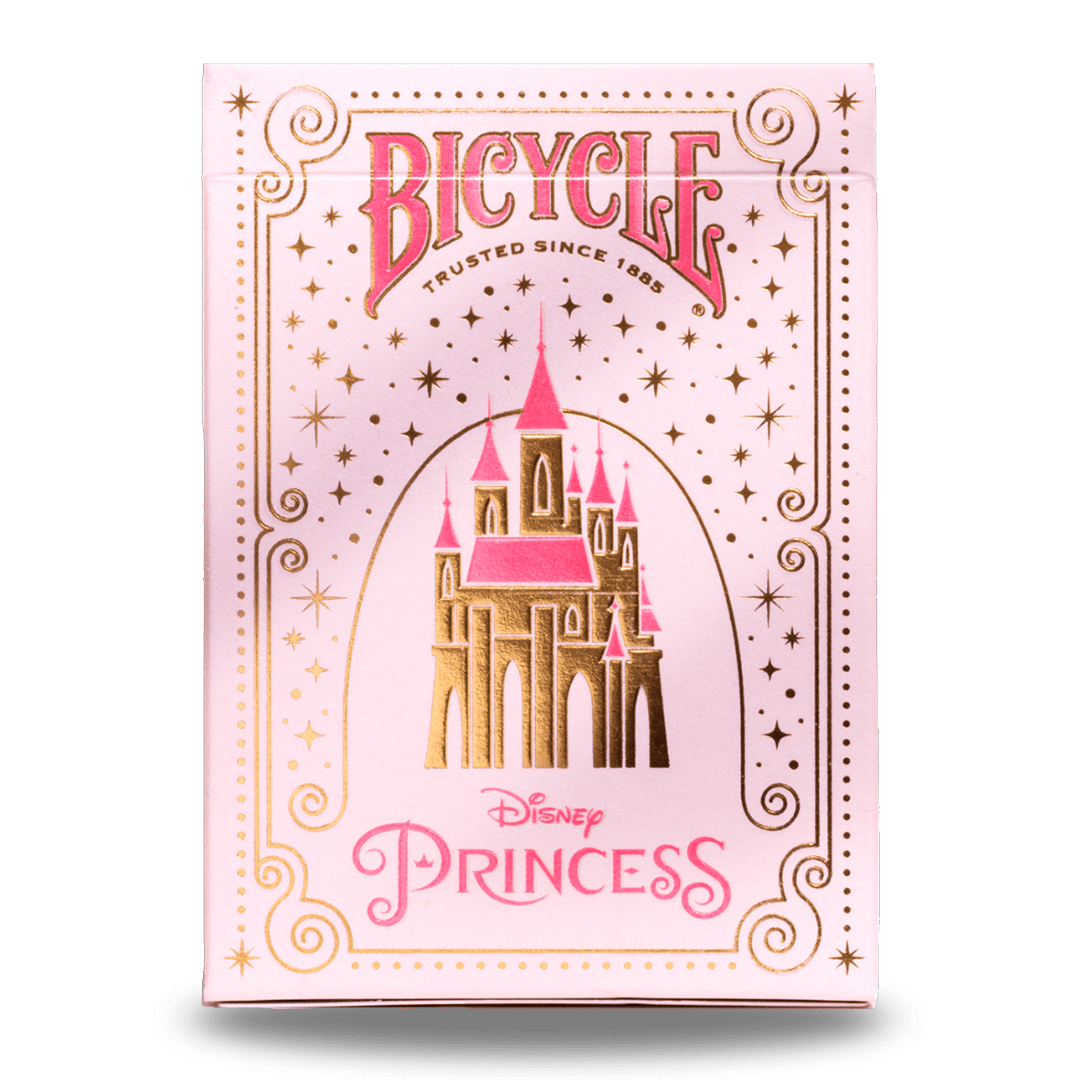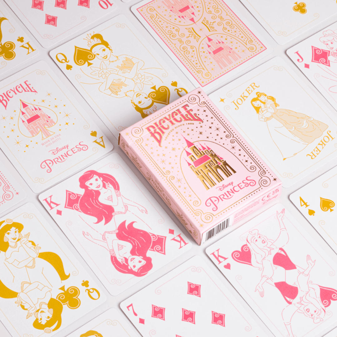 As Cartas de Baralho Disney Princess da Bicycle apresentam o icônico castelo da Disney na frente, com detalhes em folha de ouro e holográfica na caixa. As faces das cartas apresentam cartas com ilustrações de 12 diferentes Princesas da Disney como Cinderela, Ariel, Bela, Branca de Neve, entre outras.