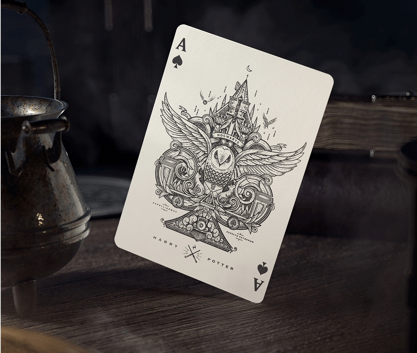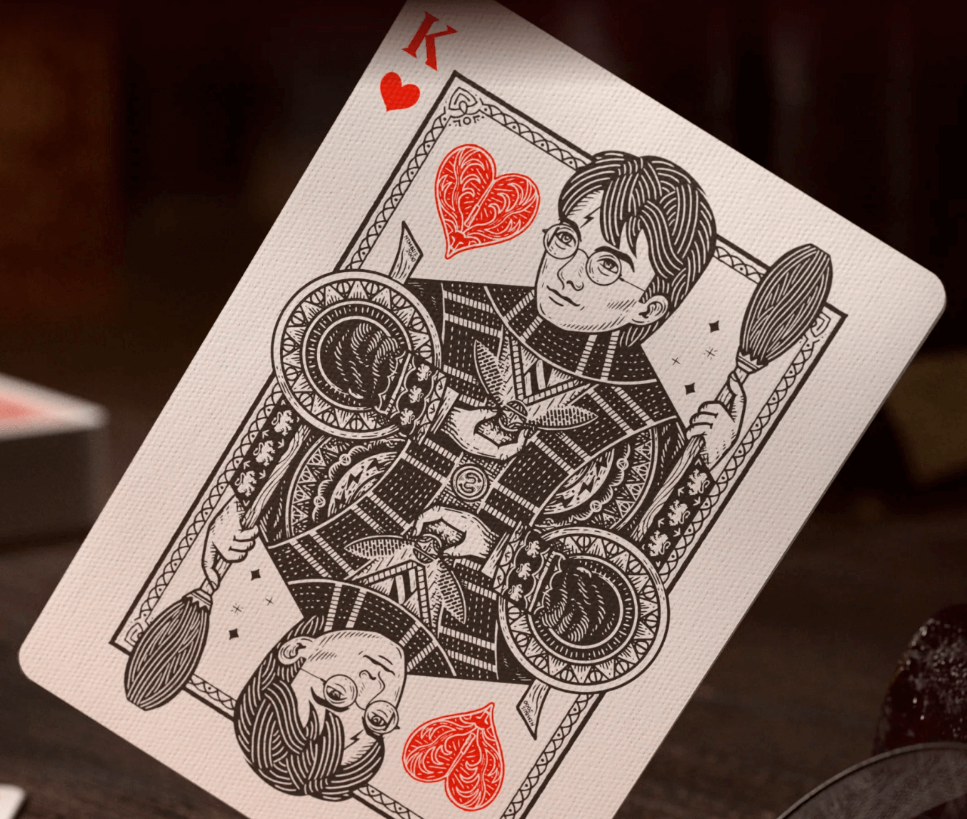 Personagens como Harry, Hermione, Lord Voldemort, Dobby e outras inesquecíveis figuras estão presentes neste baralho. A coloração predominante das cartas é um lindo vermelho e na caixa, um tom ainda mais forte que traz beleza a qualquer lugar que o baralho venha a ficar exposto.