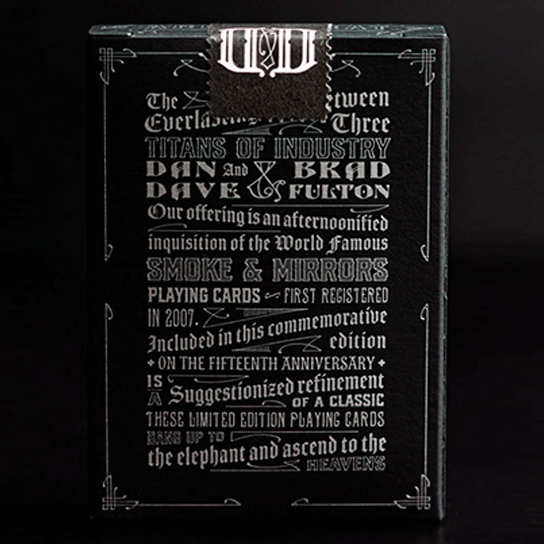 Para comemorar o décimo quinto aniversário do lançamento dos baralhos Smoke & Mirrors, Brad Fulton (amigo e colaborador de longa data) junto com a Smoke & Mirrors projetaram uma edição totalmente nova inspirada na tipografia do século XIX, fazendo uma homenagem ao design original da marca com detalhes em preto e branco para um visual sofisticado.