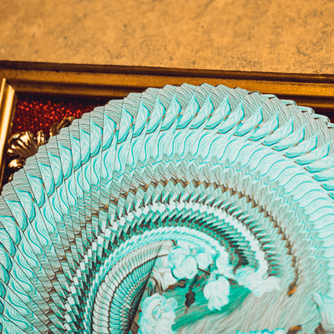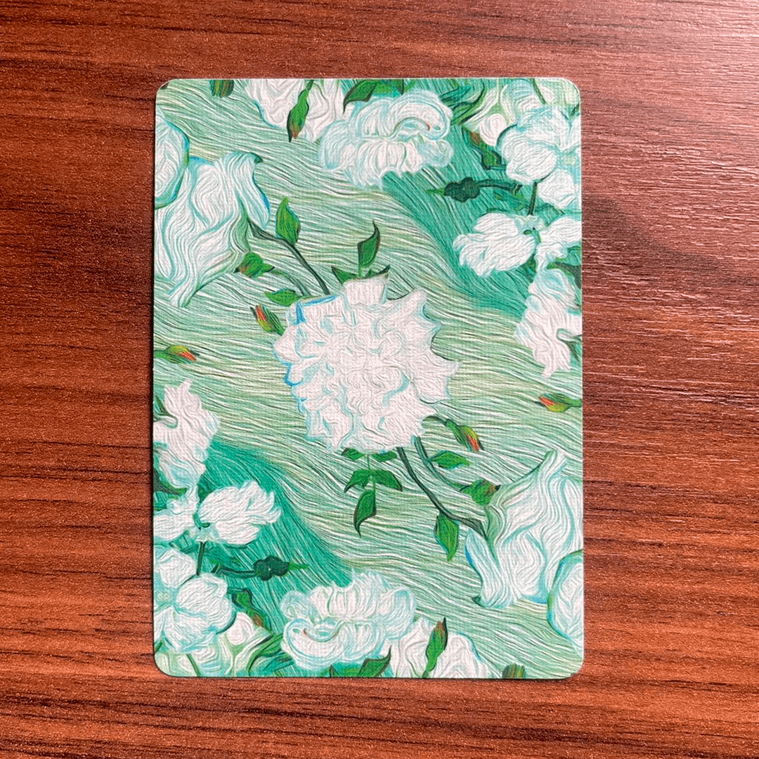 Uma grande área de verde em tons frios ocupa toda a imagem da carta, mergulhando instantaneamente as pessoas na tranquilidade que ela cria; verde, branco e dourado raramente são vistos no design de baralhos, refletindo a estética sofisticada do grande artista e alcançando a singularidade da Rosa Branca.