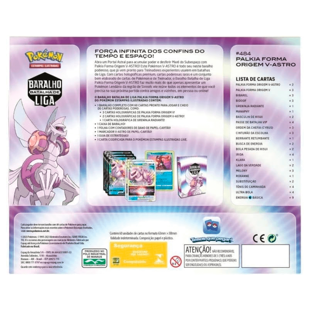 Coleção Palkia V-astro contém: 1 baralho completo (60 cartas) contendo 6 cartas holográficas, 1 caixa de baralho, 1 folha com contadores de dano, 2 moedas e muito mais.