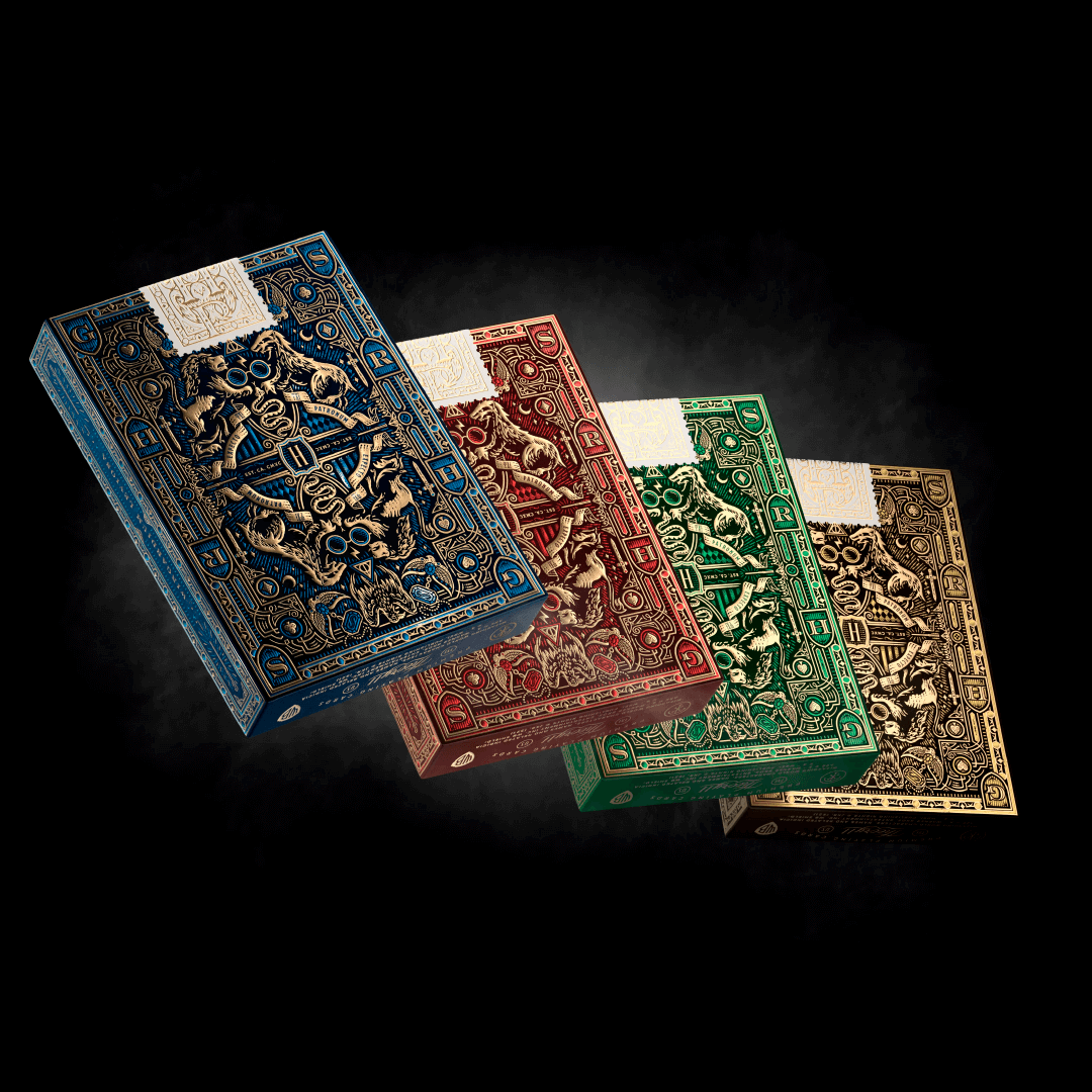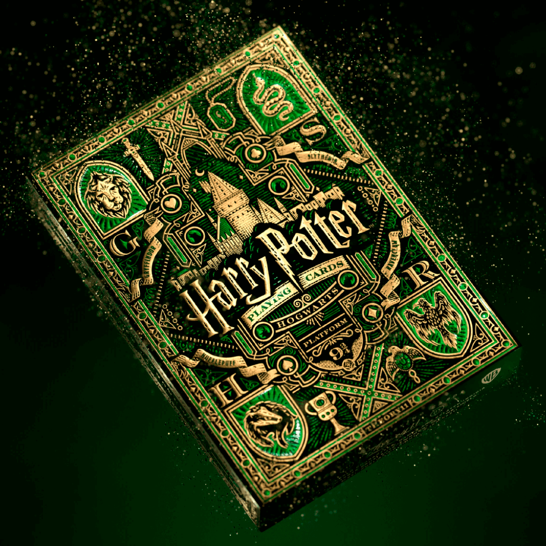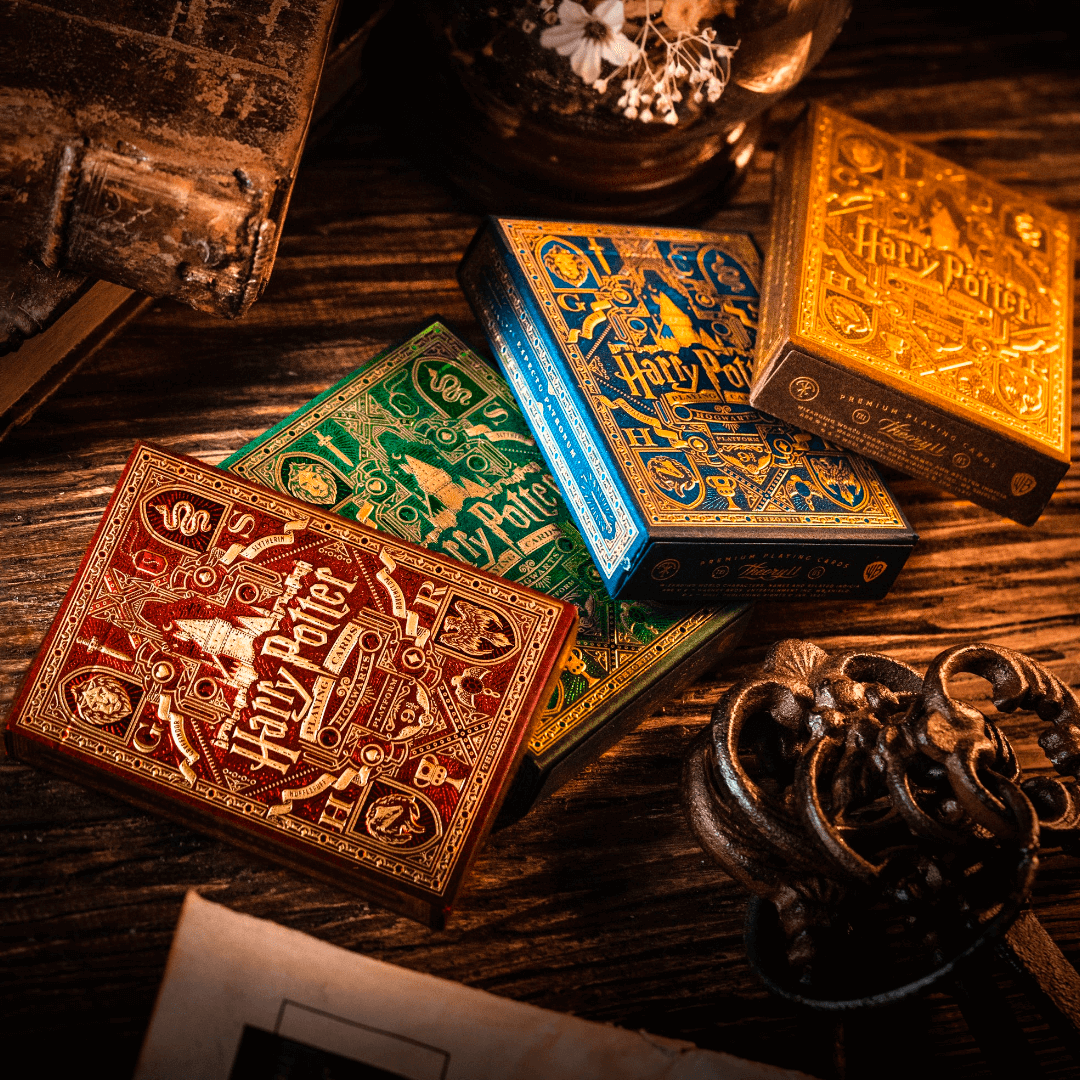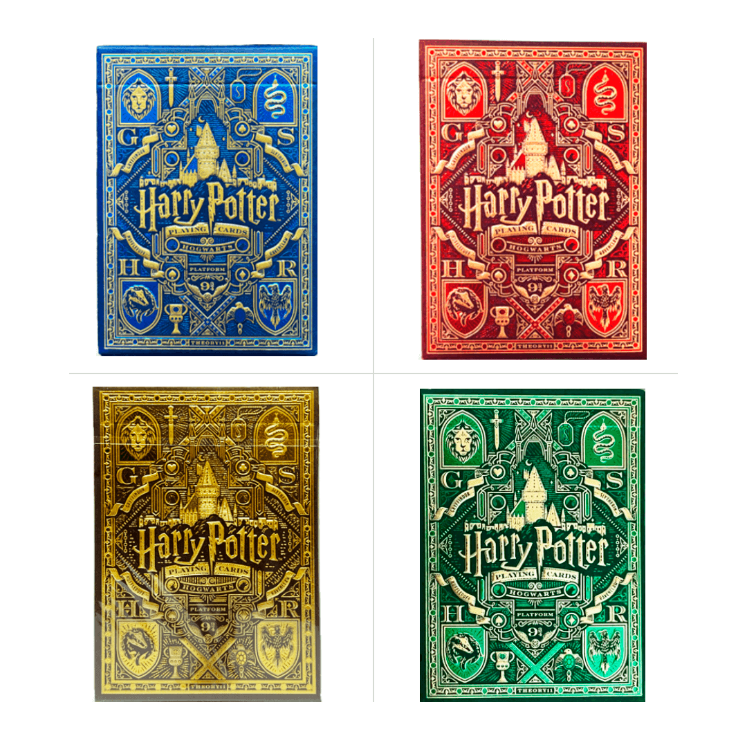 Personagens como Harry, Hermione, Lord Voldemort, Dobby e outras inesquecíveis figuras estão presentes neste baralho. Os baralhos representam a casas de Hogwarts sendo: Sonserina (Verde), Grifinória (Vermelho), Lufa Lufa (Amarelo) e Corvinal (Azul). Fabricado nos Estados Unidos pela marca Theory11.