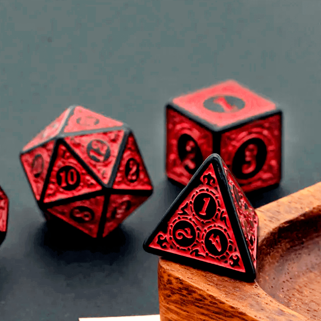 1. Logo que abri a embalagem, já senti que esse conjunto ia ser especial, os dados têm uma presença elegante com esse vermelho escuro, e a bag de couro dá aquela sensação de estar segurando um artefato mágico