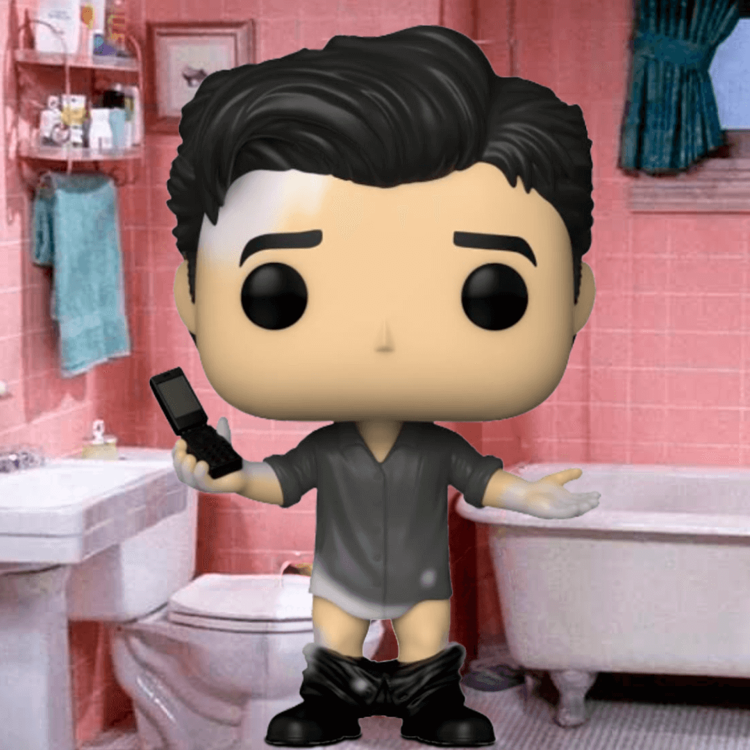 Vestido com camisa social, com o telefone em mãos e as calças de couro arriadas, esse Funko é uma representação fiel ao personagem Ross Geller.