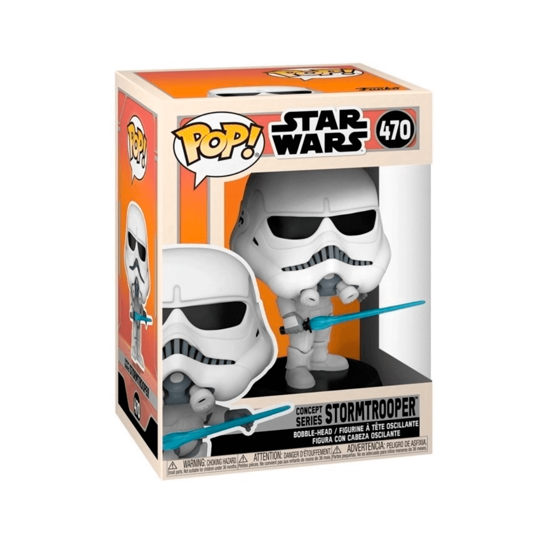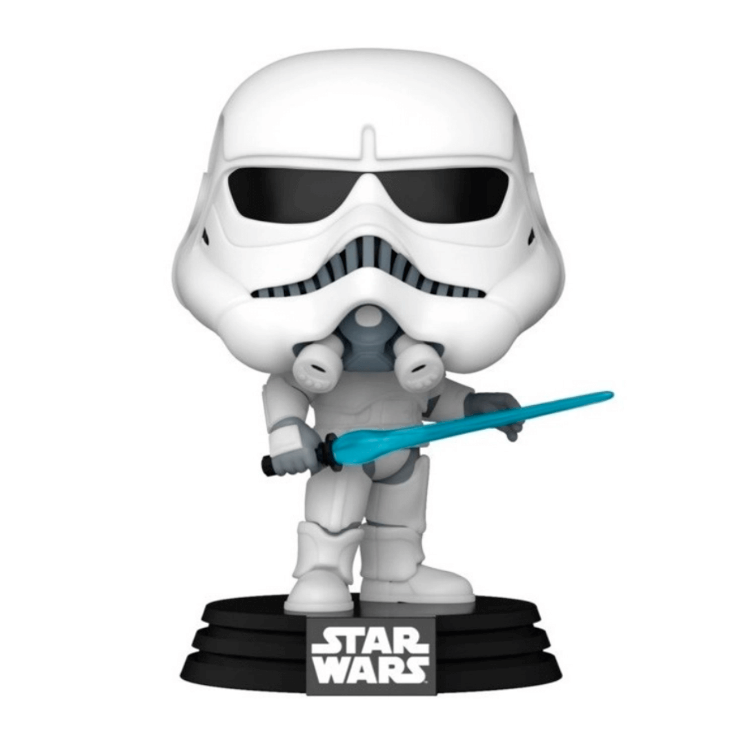 Funko Pop! Stormtrooper, edição 470. Este modelo apresenta o personagem com um sabre de luz em mãos e com pose imponente. Com uma base sólida acoplada ao Funko, esta figura se destaca por ser um tipo bobblehead. Produto original e novo.
