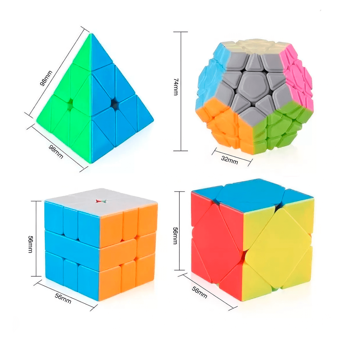 Este kit é composto por quatro cubos mágicos de diferentes formatos: Pirâmide, Megaminix, Skewb e Square-1. Cada um deles oferece um desafio único, o que torna esta box uma excelente escolha para quem gosta de resolver quebra-cabeças e desafios mentais mais complexos.