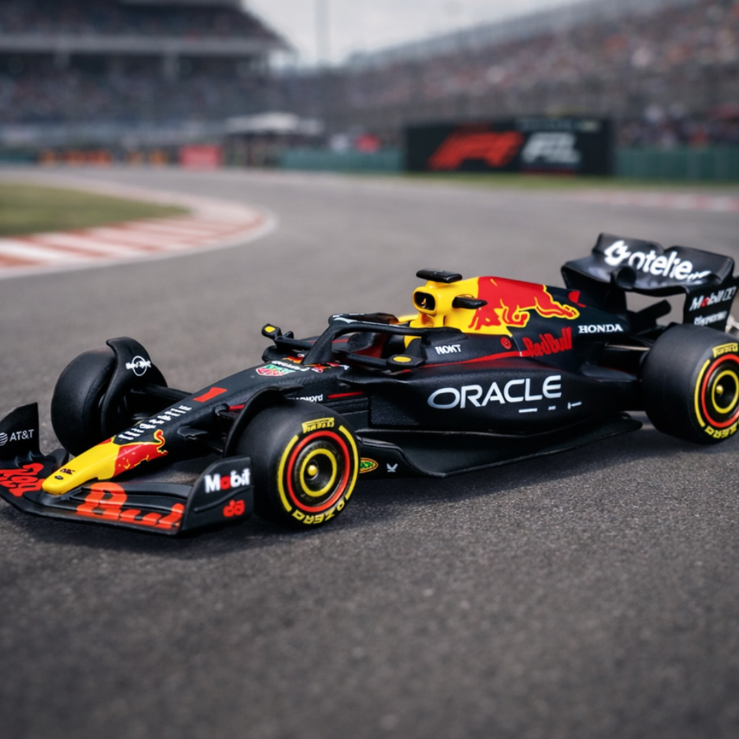A miniatura da Red Bull Racing, carro utilizado por Max Verstappen, reproduz o visual da edição de 2025 da Red Bull, com a pintura azul escuro, característica e detalhes que remetem ao carro real, mantendo um acabamento bem feito e uma qualidade extrema para o tamanho da peça.