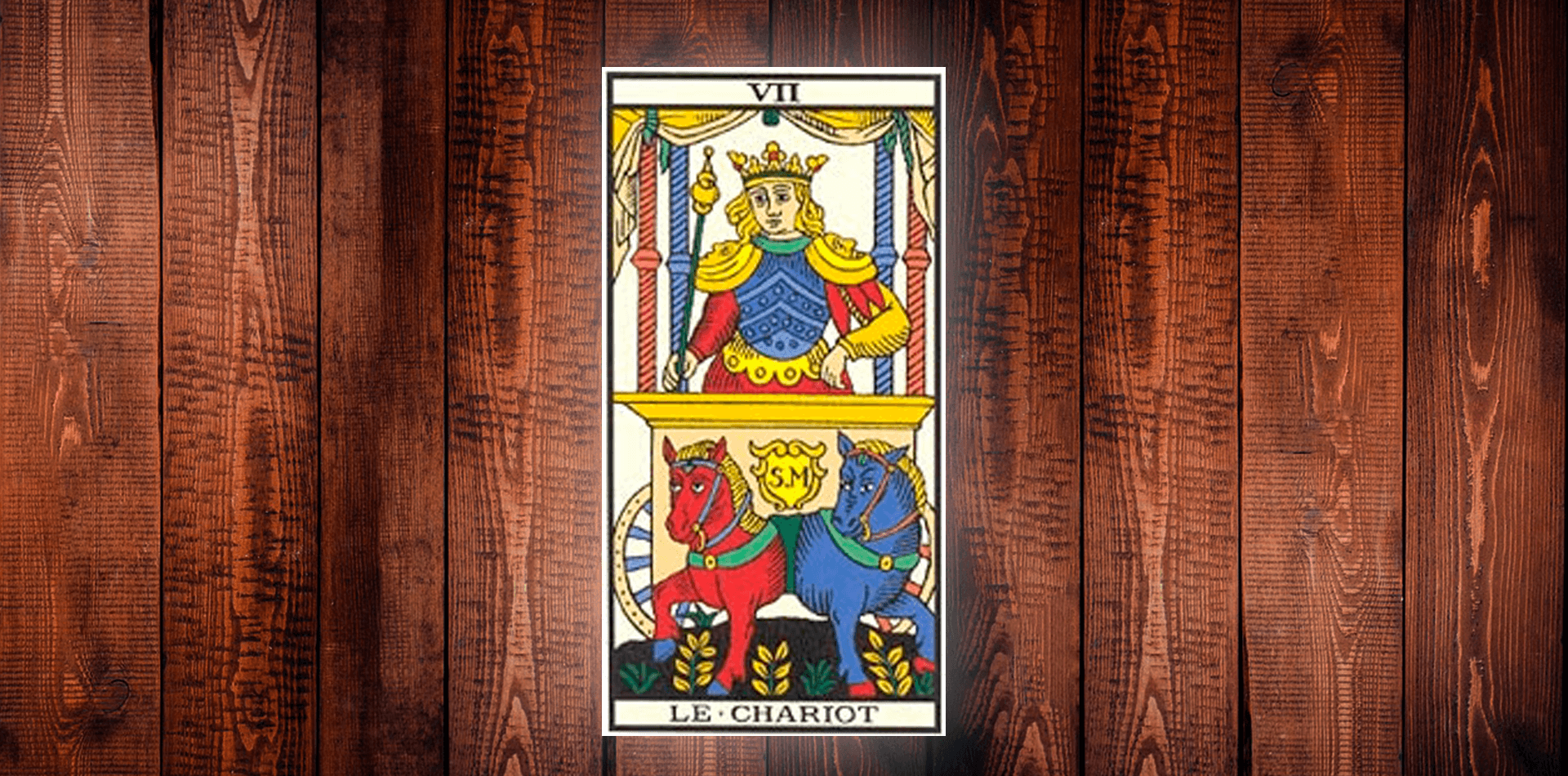 A carta do Carro representa os instintos agressivos guiados pela vontade do consciente. Os cavalos que puxam o carro seguem em direções opostas e simbolizam as ânsias animais e selvagens em conflito dentro de nós mesmos, repletas de vitalidade. Essas forças devem ser tratadas com firmeza e não devem ser reprimidas ou anuladas para ajudar a vencermos os obstáculos da vida.